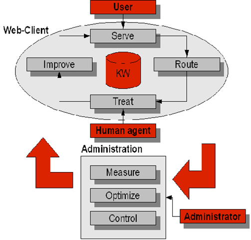 还好,俺们公司提供左图的知识库自我学习的机制。前提是有客服机制的系统。当在线知识库查询得不到满足时,系统可以将查询请求转移到客服,客服找到合适的答案,推送回给客户。我们的系统则负责在客户线上搜索的模型和客服推送回的修正的知识建立新的对应。当下一个客户进行同样的搜索时,搜索引擎返回的已经是经由客服更新的知识了。
